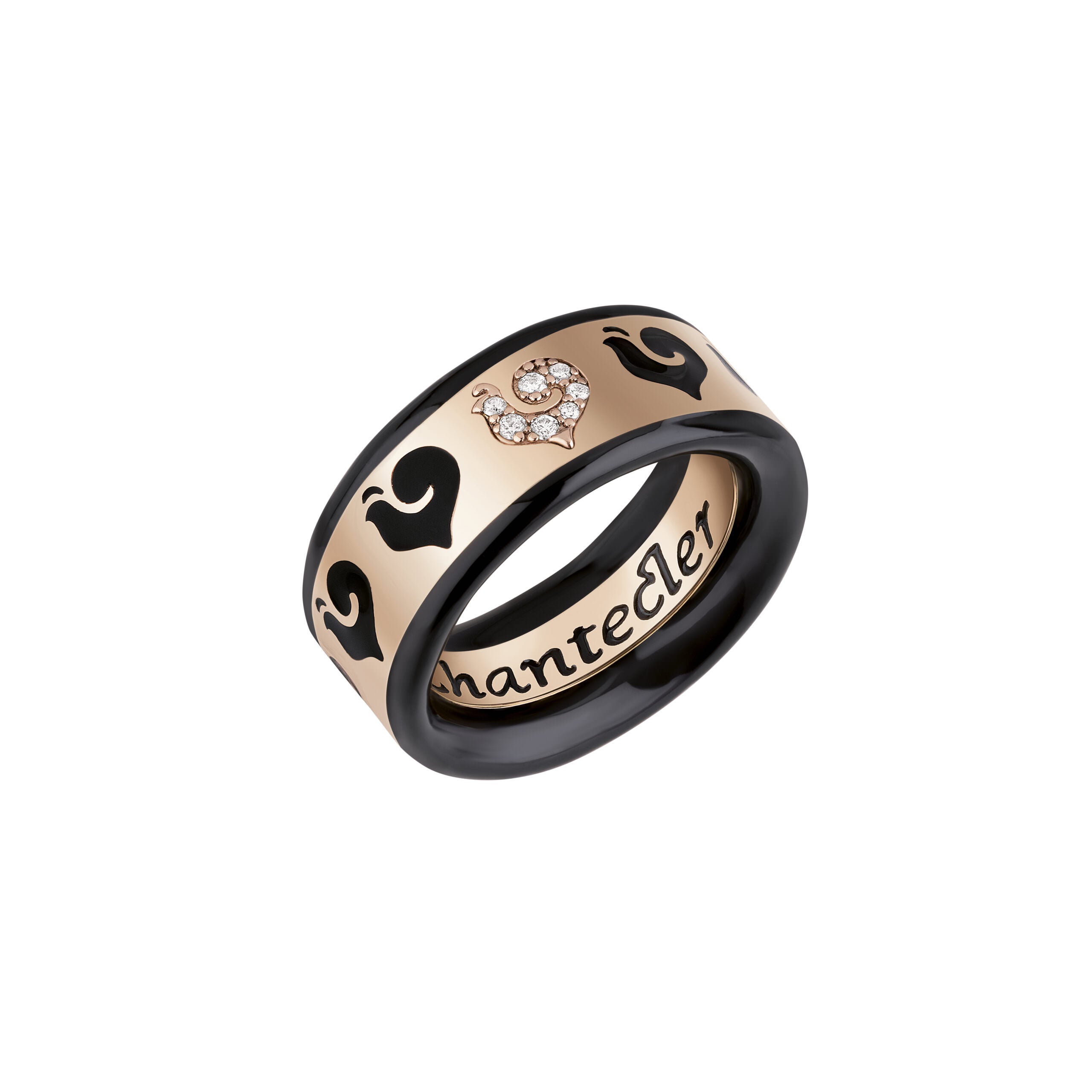 Anello fede Carousèl in oro rosa 18Kt, gallo in pavè di diamanti e smalto nero