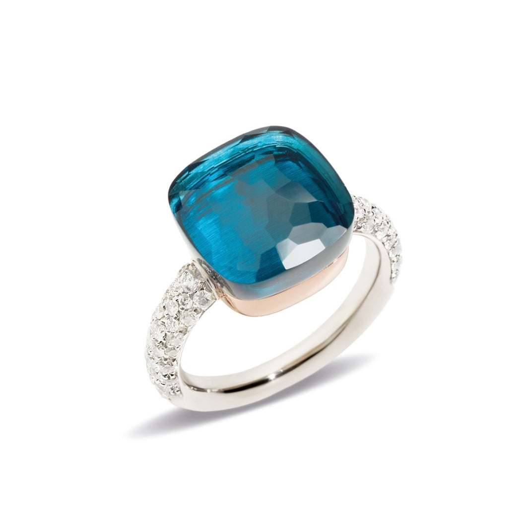Anello In Oro Bianco Rodiato E Oro Rosa 18k Con 1 Topazio Blu London (≈15 Ct) E 58 Diamanti Bianchi (≈0.7 Ct) Su Oro Bianco Rodiato 18k.
