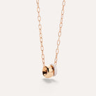 Questo pendente in oro rosa con diamanti bianchi riproduce in miniatura il leggendario anello e ciondola leggero da una catena in oro rosa delicata e regolabile, riassumendo con grazia il fascino discreto dell'eleganza milanese.